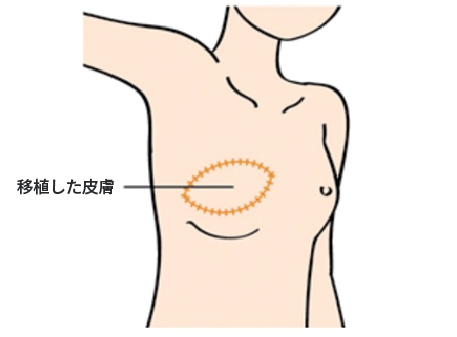 ティッシュエキスパンダーを大胸筋の下に留置し、傷を閉じます。手術時間は約1時間半程度、 入院期間は手術後5日~14日程度。