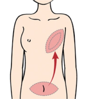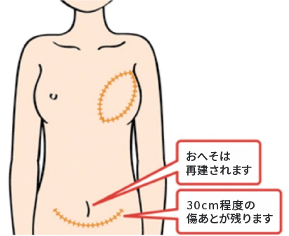 大きな乳房に適しており、お腹の皮膚・脂肪・筋肉を血管(深下腹壁動静脈など)ごと移植します。下腹部に傷が残る、妊娠希望者には不向きなどの点があります。