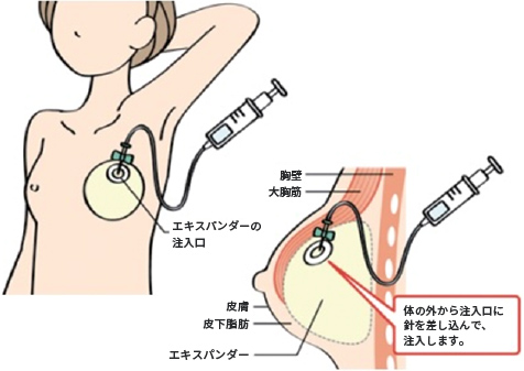 ②エキスパンダーに生理食塩水を注入する。約2週間ごとに1~6か月かけて追加注入する。