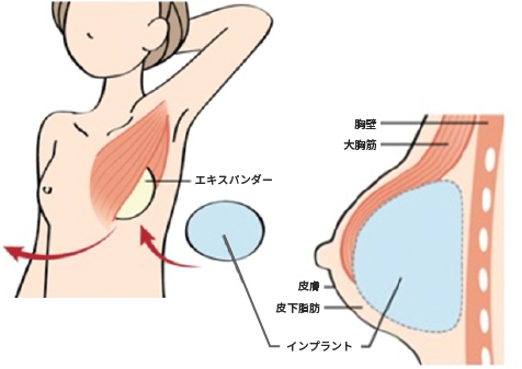 ティッシュエキスパンダーで皮膚と大胸筋を伸展させます。 組織を十分に伸展させた後、伸展した組織が安定するまで6-12カ月程度待機。